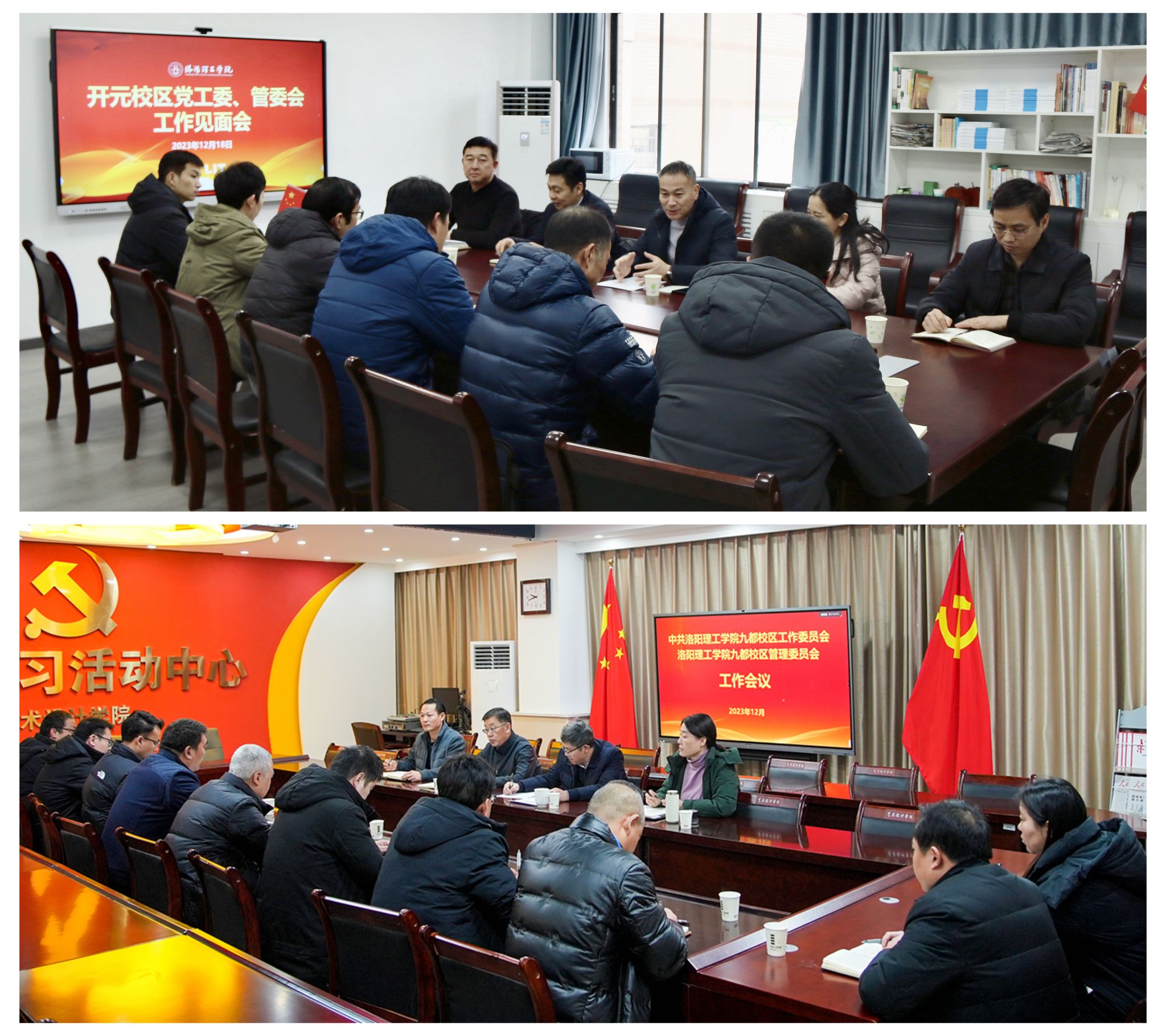 12月18日下午,美高梅娱乐场 开元校区党工委、管委会在开元校区XD302召开工作会议。校党委副书记、工会主席、开元校区党工委书记曾涛,副校长、开元校区管委会主任黄志全出席会议,党委组织部负责人及开元校区党工委、管委会相关人员参加了见面会。12月19日上午,九都校区党工委、管委会在九都校区召开工作会议。校党委副书记、九都校区党工委书记胡恩立,副校长、九都校区管委会主任王新武出席会议,九都校区党工委、管委会成员及艺术设计美高梅娱乐场 领导班子参加会议。
