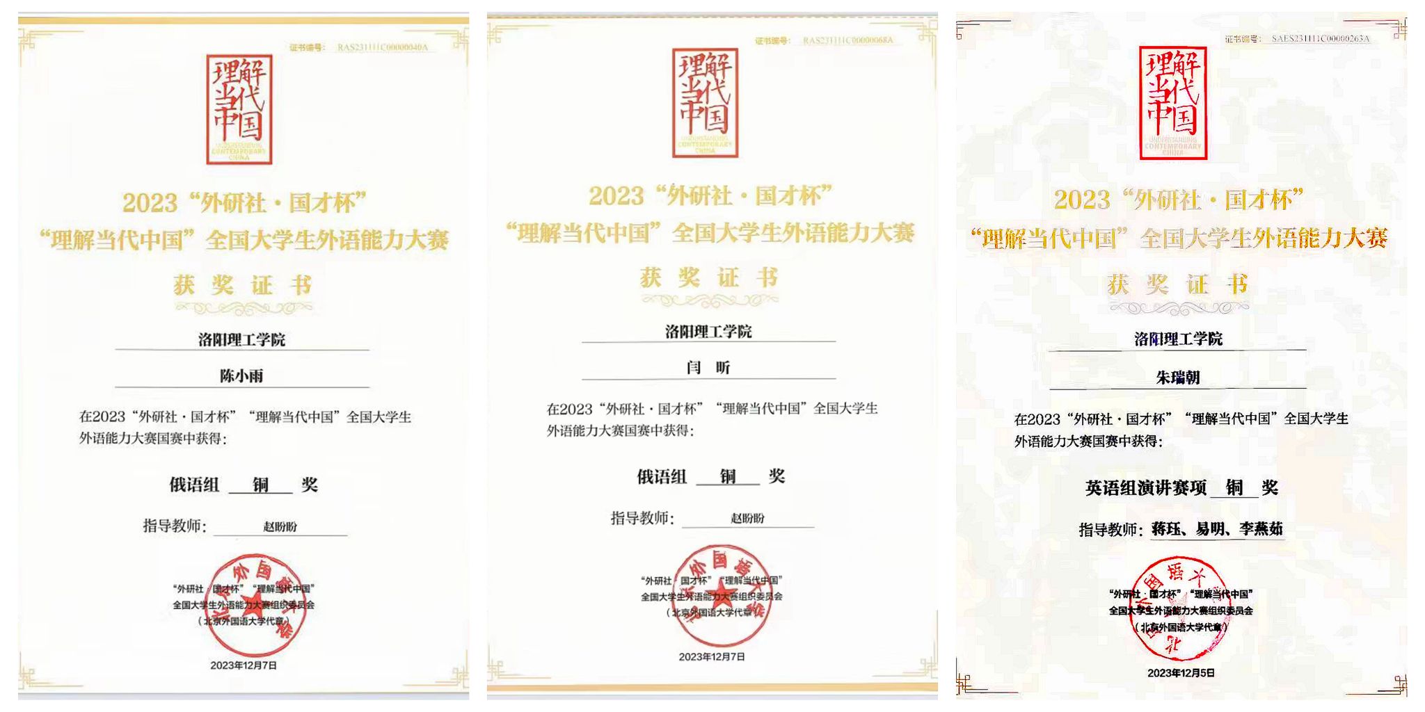 参加了2023“外研社•国才杯”“理解当代中国”全国大学生外语能力大赛国赛。经过激烈角逐,2021级俄语专业学生陈小雨、闫昕在赵盼盼老师指导下荣获俄语组铜奖,2021级翻译专业学生朱瑞朝在蒋珏、易明、李燕茹三位老师指导下荣获英语组演讲赛项铜奖,实现了美高梅娱乐场