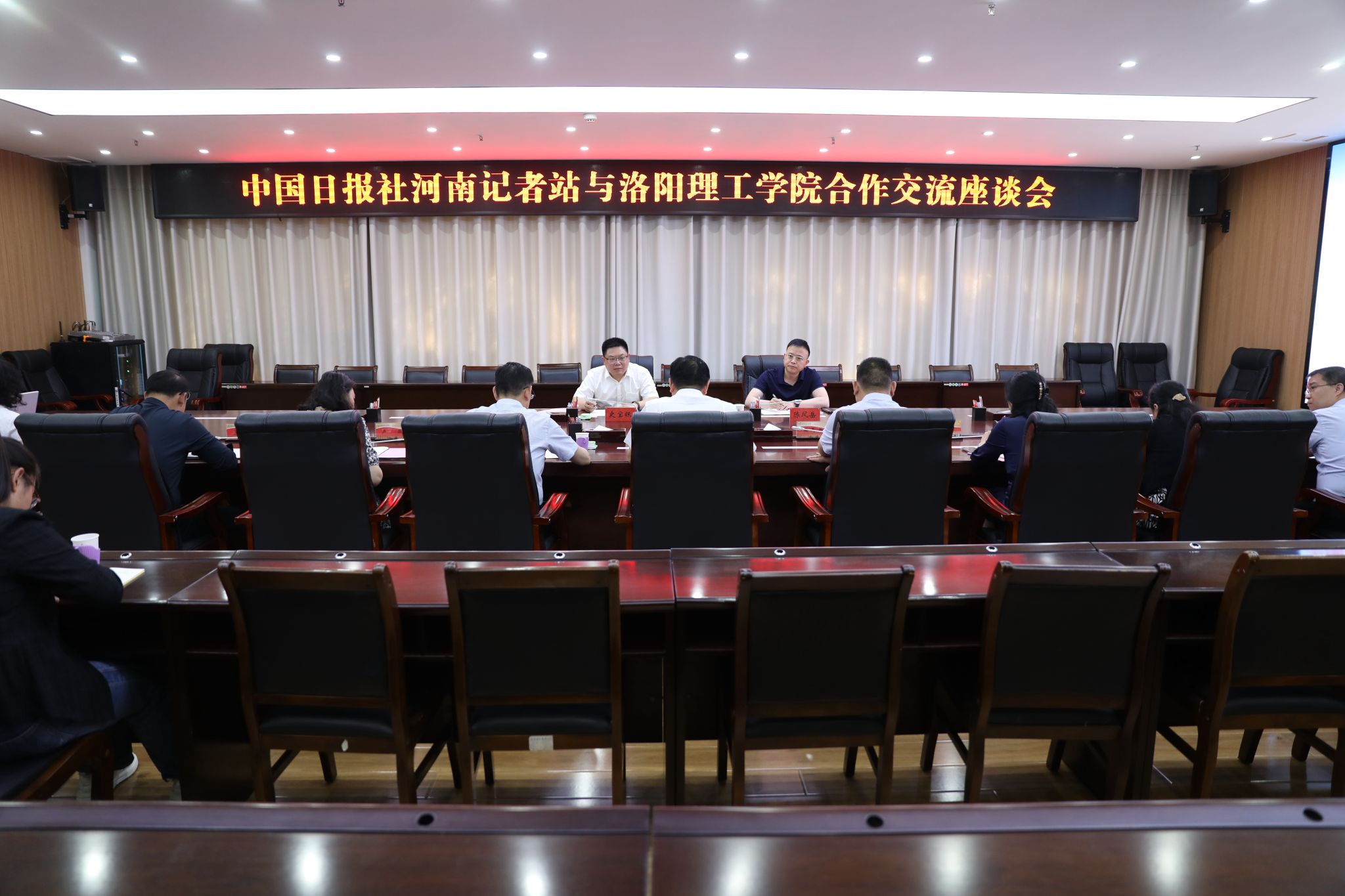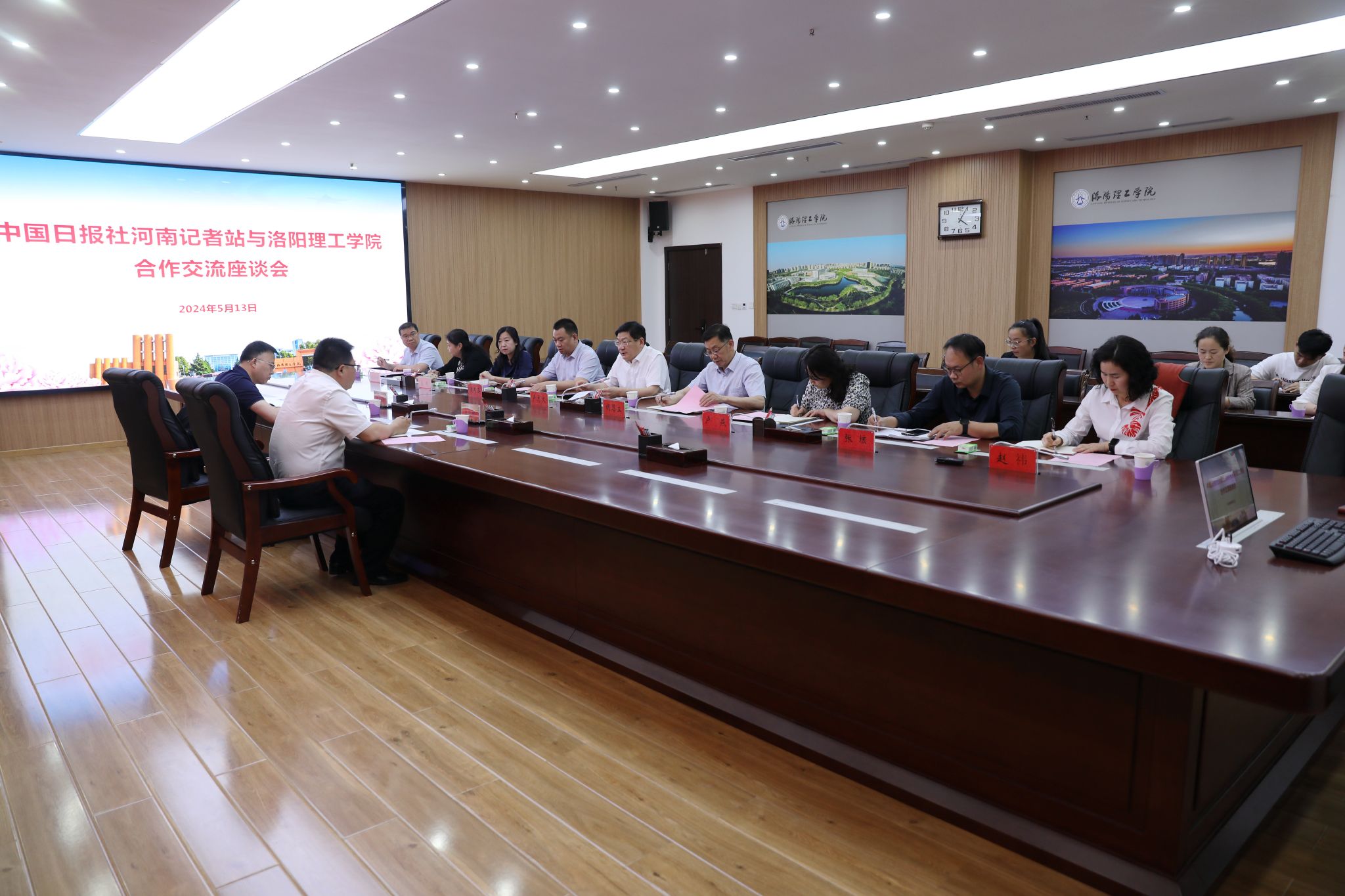 5月13日下午,中国日报社河南记者站站长史宝银、主任陈凤岳一行莅临美高梅娱乐场 调研指导。交流座谈会在王城校区办公楼116会议室举行,党委书记卢志文、党委副书记胡恩立出席会议,党委宣传部、美高梅娱乐场合作 合作处、校团委、外国语美高梅娱乐场 等相关部门负责人参加会议。会议由胡恩立主持。