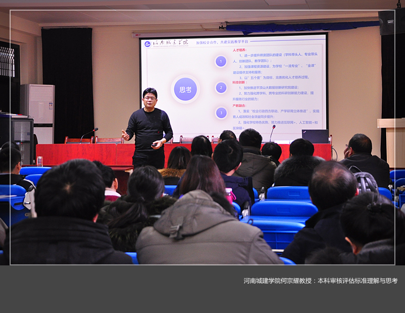 何宗耀教授从“人才培养目标和定位“、“教学质量控制“、”师资队伍建设“、”教学支撑条件“、”规章制度管理“等五个方面对审核评估工作进行了深刻解读,并结合河南城建美高梅娱乐场