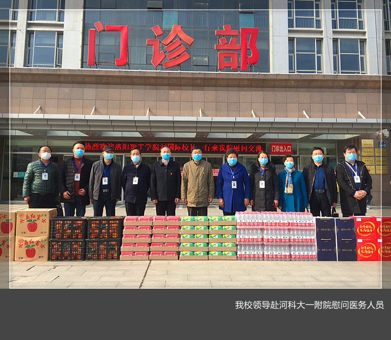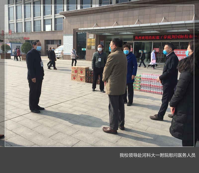 3月5日下午,校长刘国际、校工会主席曾涛一行5人来到河南科技大学第一附属医院开元院区慰问奋战在抗击新冠肺炎防治一线的医务工作者,并送去了价值5000元的慰问品。