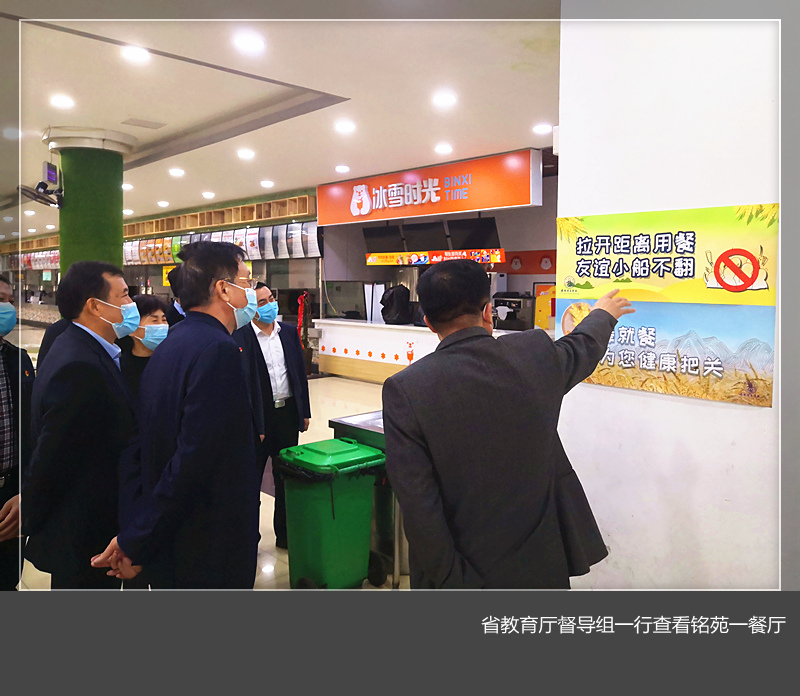看到健康隔离观察区标识明晰,区域划分科学规范,软硬件设施完备;校园餐厅干净卫生,空气通畅,就餐流程及区域划分合理,标识清晰,新加装的洗手设施使用便捷;校友研发捐赠的红外体温检测设备高端便捷,测温灵敏准确;校园内随处可见各类防疫宣传海报标语,各类警示、服务标语亲切醒目。