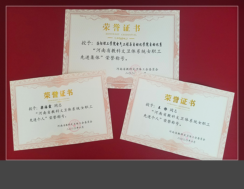 自动化系被授予“河南省教科文卫体系统女职工先进集体”荣誉称号,体育教学部第二教研室被授予洛阳市“三八”红旗集体荣誉称号,党政办王静、艺术设计美高梅娱乐场