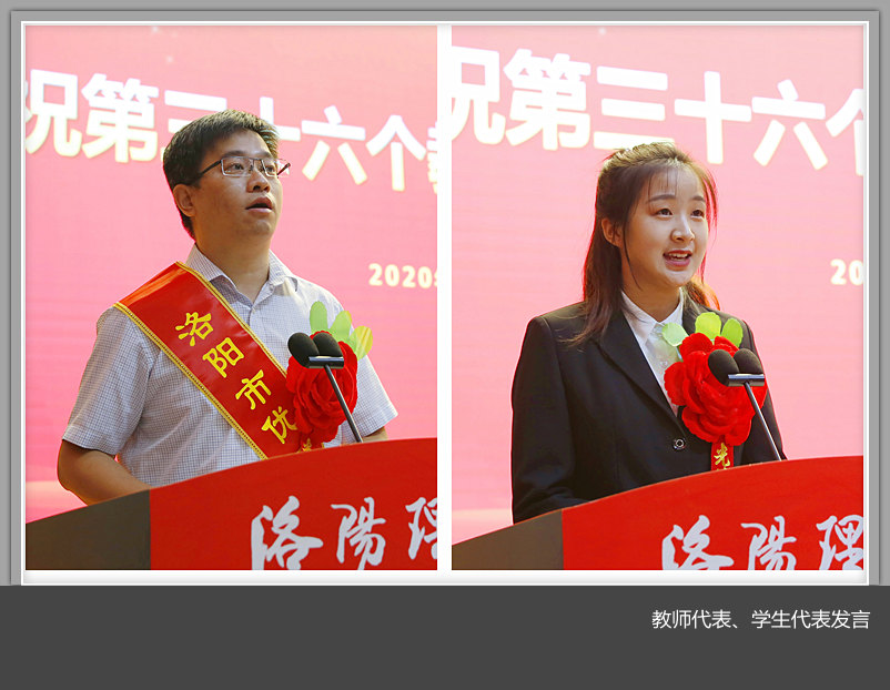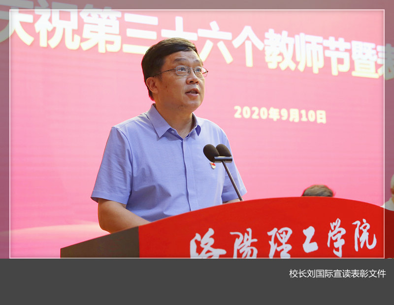 校长刘国际宣读了表彰文件。大会对河南省首批省级教师教学发展示范中心、河南省和洛阳市高层次人才、河南省和洛阳市学术技术带头人、河南省教育厅优秀教育管理人才、河南省文明教师、河南省高校辅导员年度人物、河南省教科文卫体系统最美教师、洛阳市优秀教师及洛阳市优秀教育工作者、校级优秀教师及优秀教育工作者、“从教满三十年”人员、优秀教学督导员等优秀教师代表进行了表彰。