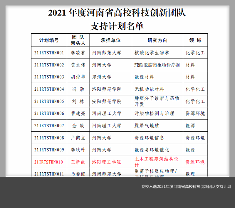 王新武教授带领的“土木工程建筑结构设计”科研团队入选2021年度河南省高校科技创新团队支持计划。