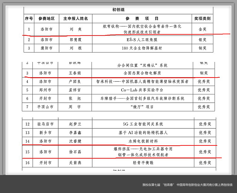 近日,共青团河南省委发布《关于发布第七届“创青春” 中国青年创新创业大赛河南分赛暨“创出彩”河南青年创新创业大赛获奖名单的通知》(豫青联字 〔 2020〕39号),大赛共设9个组别,每个组别分别设金奖、银奖、铜奖各1个,9个组别还共设置优秀奖65个。美高梅娱乐场