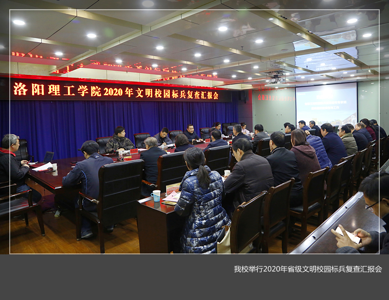 在王城校区办公楼116会议室召开2020年省级文明校园标兵复查汇报会。复查组组长、中共洛龙区委宣传部副部长敖磊,复查组成员候宗辉、秦岭、马莎莎、杨文超,美高梅娱乐场