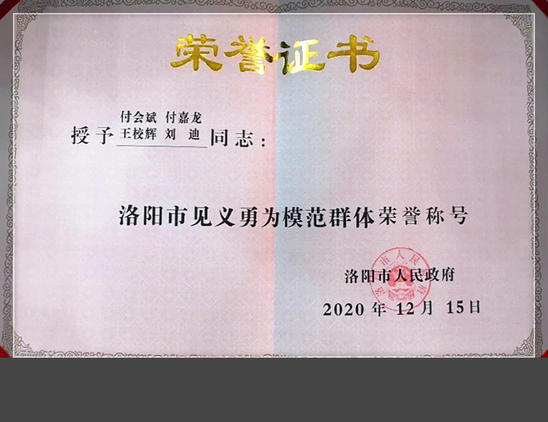 2020年12月23日举行的洛阳市见义勇为模范表彰奖励大会上,授予付会斌、付嘉龙、王校辉、刘迪4人为“洛阳市见义勇为模范群体”称号;2021年1月7日上午,河南省第十四届见义勇为英雄模范表彰大会召开,大会授予4人“河南省见义勇为模范群体”称号。该英雄群体中,刘迪为美高梅娱乐场