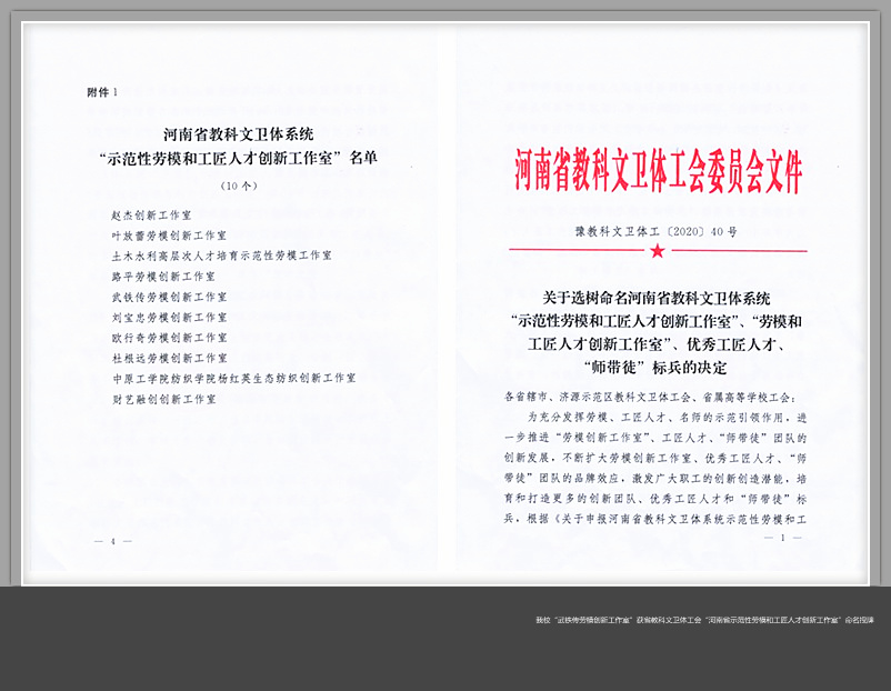 近年来,校工会积极“劳模创新工作室”创建工作,组织申报河南省教科文卫体工会“劳模创新工作室”和“示范性劳模创新工作室”,两年以来的创建实践成效突出,劳模创新工作室在人才培养、教学改革、科技创新中发挥了显著的示范引领作用。