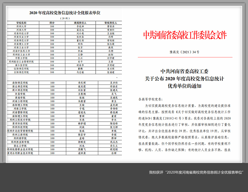近日,省委高校工委下发了《关于公布2020年度高校党务信息统计优秀单位的通知》(豫高发〔2021〕34号),对2020年度全省各高校党务信息统计质量进行了通报,美高梅娱乐场