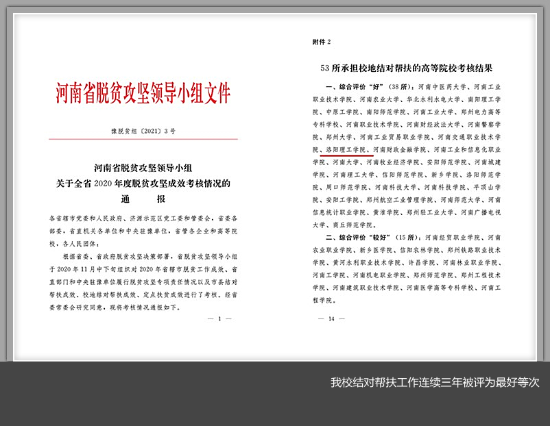 作为承担与宜阳县校地结对帮扶工作的单位,被确定为综合评价“好”的高等院校。自2018年全省“校地结对帮扶”精准扶贫行动工作开展以来,美高梅娱乐场