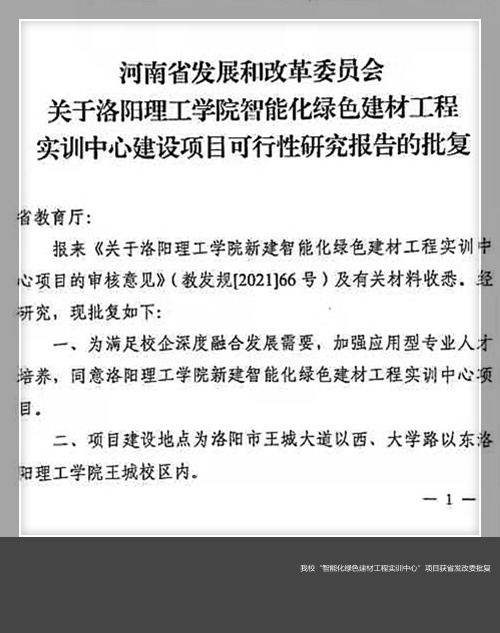 近日,河南省发展和改革委员会下达批复文件,同意美高梅娱乐场 建设”智能化绿色建材工程实训中心”。该项目位居王城校区院内,总建筑面积23654平方米,总投资估算14350万元,是国家支持地方应用型本科高校实施产教融合的重大工程项目,也是美高梅娱乐场 近十年来获批上级财政支持的重大基础建设项目。按照计划进度,该项目将于2022年初开工建设,2023年建成投入使用。
