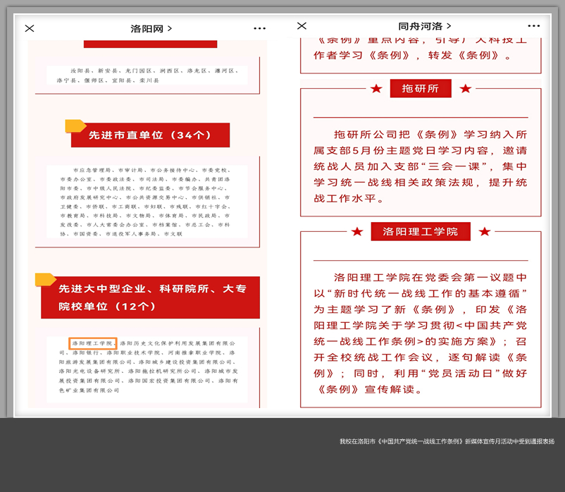 近日,洛阳市委统战部对在洛阳市《中国共产党统一战线工作条例》新媒体宣传月活动中组织有力、成效突出的10个县区,34个市直单位,12家大中型企业、科研院所、大专院校予以通报表扬。美高梅娱乐场 由于发动有力,效果显著,在参与的114个单位中排名第14,受到通报表扬。