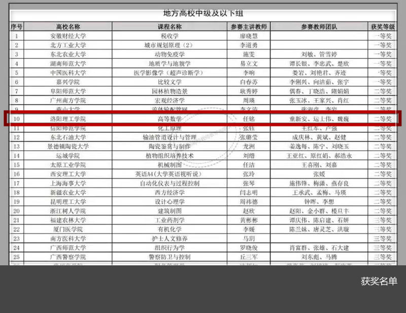 数学与物理教学部教师任铭作为河南选拔赛杰出选手奖获得者,组建了《高等数学》课程团队(成员童新安、运士伟、魏巍),参加了此次全国大赛。比赛环节主要包括网络评审和现场评审。任铭作为团队主讲教师,以《变革与创新中的高等数学》为题,从学情分析与课程目标、课程设计与资源建设、课程组织与考核评价、创新特色与改革成效对《高等数学》课程的教学创新设计情况进行了详细的介绍,并对专家评委的现场提问进行了认真解答。按照课堂教学实录视频(网络评审)成绩50%、课程教学创新成果报告(网络评审)成绩15%、教学创新设计汇报(现场评审)成绩35%的计算方法,最终获得首届全国高校教师教学创新大赛二等奖。
