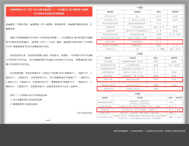 近日,河南省教育厅公布了“100名师生颂党情”——“永远跟党走 奋斗新征程”庆祝建党100周年活动获奖名单。“100名师生颂党情”——“永远跟党走 奋斗新征程”庆祝建党100周年活动主要包括“1岁致敬100岁”“青春寄语党”“讲个故事给党听”等3项内容。目的在全省美高梅娱乐场