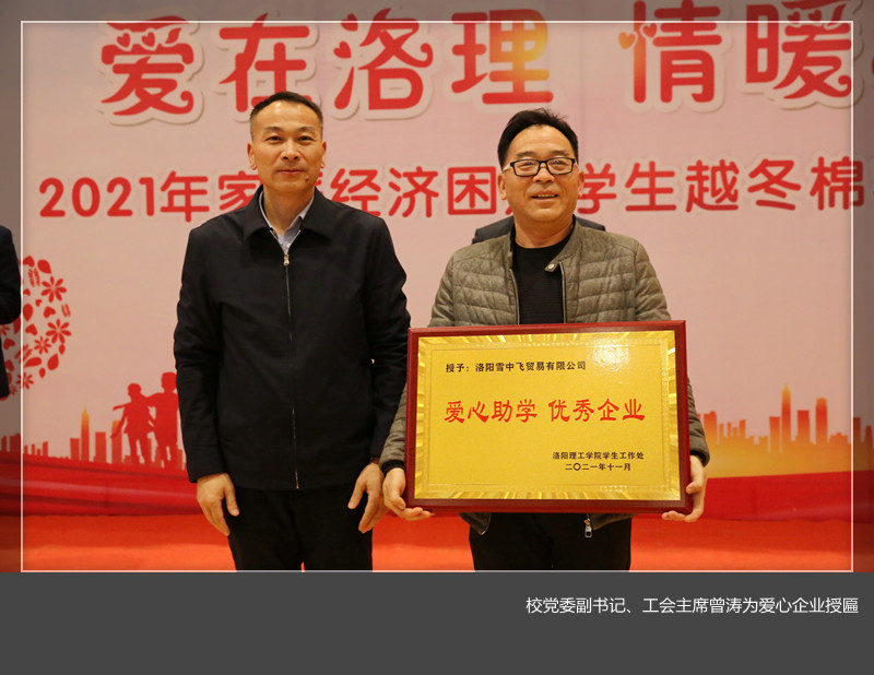 曾涛在仪式上为洛阳雪中飞贸易有限公司颁发“爱心助学优秀企业”牌匾。