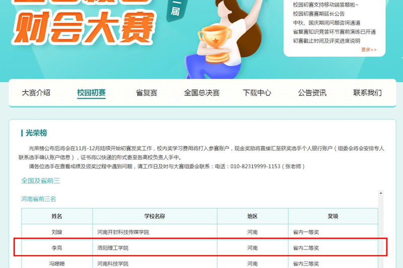2019级会计专业学生李克在“中华会计网校杯” 第十一届全国校园财会大赛校园初赛中,从河南省十八所高校10803名参赛选手中脱颖而出,获得河南省第二名的优异成绩,并得到大赛组委会的表彰和奖金奖励。该成绩创造了美高梅娱乐场