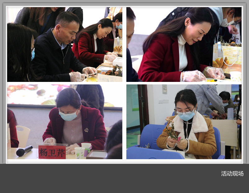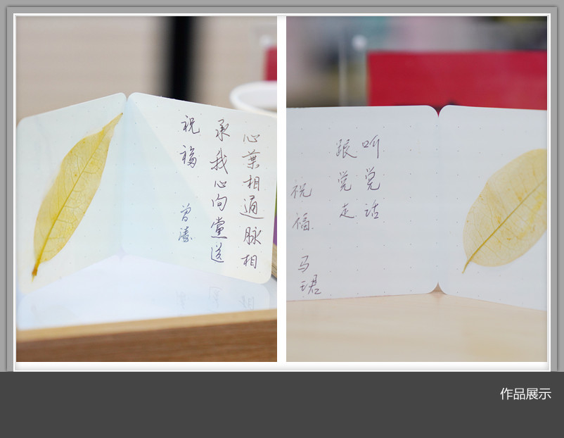 学生为老师们讲述了叶脉书签的制作过程。他们将叶子用氢氧化钠溶液煮好,刷酸处理。伴随着轻柔的音乐,老师们聚精会神,使用牙刷轻轻顺着叶脉的方向刷掉叶肉,留下清晰的叶脉,最后将叶脉做成书签,夹在贺卡中定型,并写上对党百年华诞的祝福。在花艺创作环节,老师们将花草摆放、粘连成不同的造型,固定在相框中,纷纷写下对党的寄语。大家兴致盎然,精心设计,认真体会花艺制作所呈现的季节流转之美。