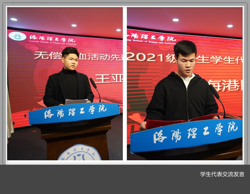 王亚琦和新生代表仵海港在现场分别作交流发言。他们表示将积极参与无偿献血活动的倡议,号召大家用无私大爱的真情诠释对生命的尊重,用洛阳理工学子的无限爱意展现新时代大学生践行志愿服务精神,爱洛爱校、勇于担当的青春风貌。