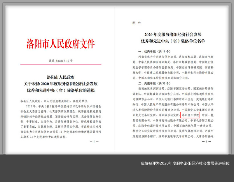 近日,洛阳市人民政府发布《关于表扬2020年度服务洛阳经济社会发展优秀和先进中央(省)驻洛单位的通报》(洛政〔2021〕19号),美高梅娱乐场 被评为2020年度服务洛阳经济社会发展先进单位。