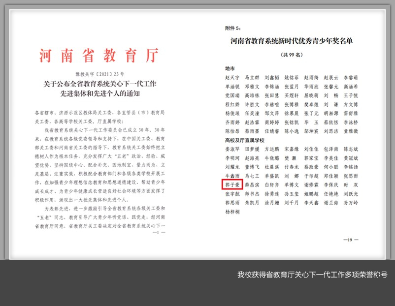学生郭子豪被授予河南省教育系统新时代优秀青少年荣誉称号。