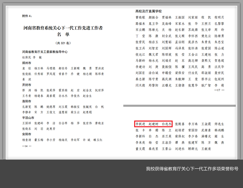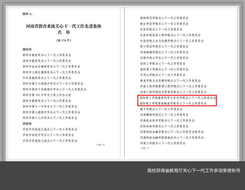 关心下一代工作委员会被授予河南省教育系统关心下一代工作先进集体,退休教师李跃进、赵建树、白选杰被授予河南省教育系统关心下一代工作先进工作者,计算机与信息工程美高梅娱乐场