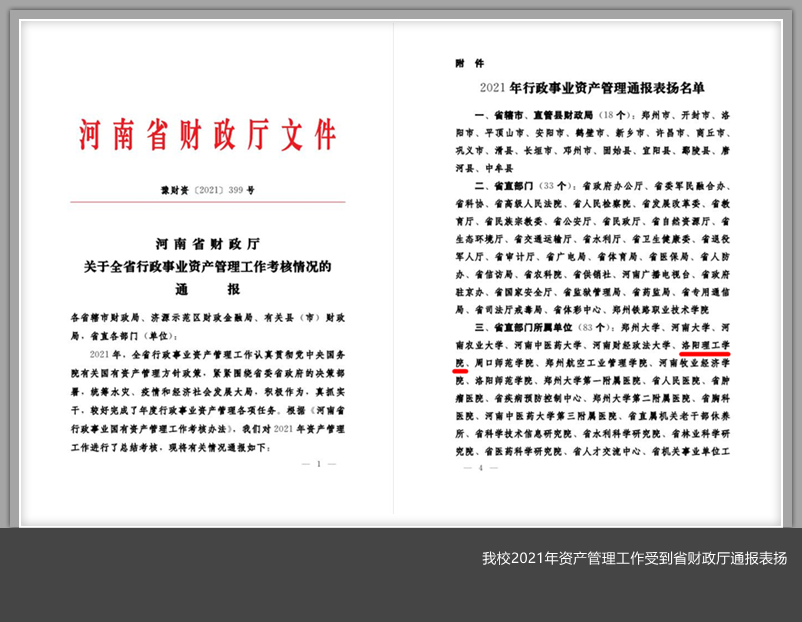 据悉,资产管理工作考核是省财政厅根据《河南省行政事业单位国有资产管理工作考核办法》在全省市县财政管理部门、省直部门和省直部门所属单位中进行的,被通报表扬的教育系统单位首先要经省教育厅推荐才能入围,全省高校仅有10所受到通报表扬。
