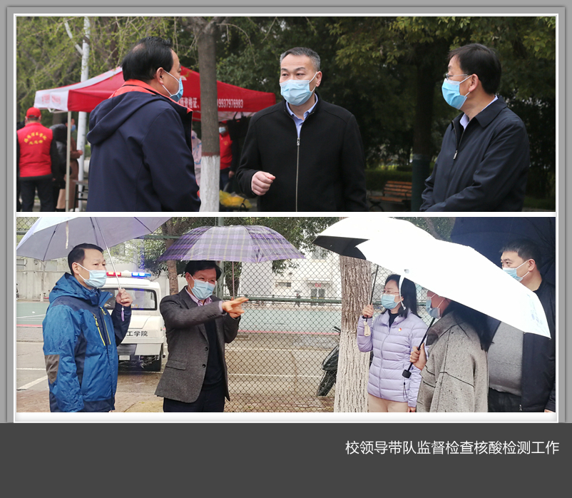 校领导曾涛、胡恩立、刘楠带队深入到三个校区多个采集点现场督导检查核酸检测工作,对各二级党组织党政负责人在岗在位、检测流程、师生秩序及疫情防控措施落实等情况进行了重点监督,对采样工作高效有序推进表示肯定。