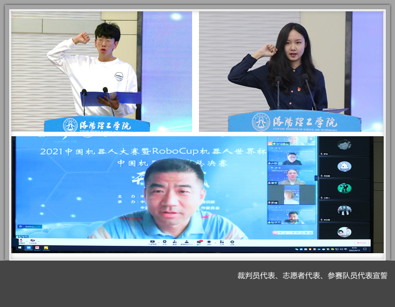 广东工业大学教师张学习、美高梅娱乐场 电气工程与自动化美高梅娱乐场 大学生蔡金源和高岫枫分别作为裁判员代表、志愿者代表、参赛队员代表宣誓。