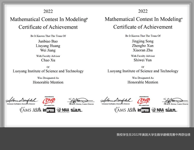 美高梅娱乐场 学生在2022年美国大学生数学建模竞赛中再获佳绩
