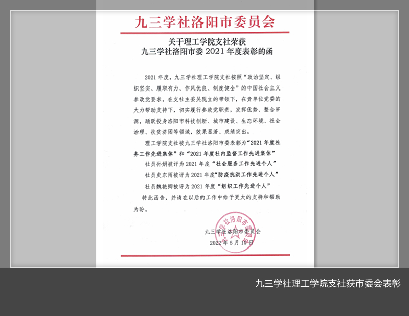 支社被九三学社洛阳市委表彰为“2021年度社务工作先进集体”、“2021年度社内监督工作先进集体”;社员孙娟被评为2021年度“社会服务工作先进个人”,史东雨被评为2021年度“防疫抗洪工作先进个人”,魏艳卿被评为2021年度“组织工作先进个人”。