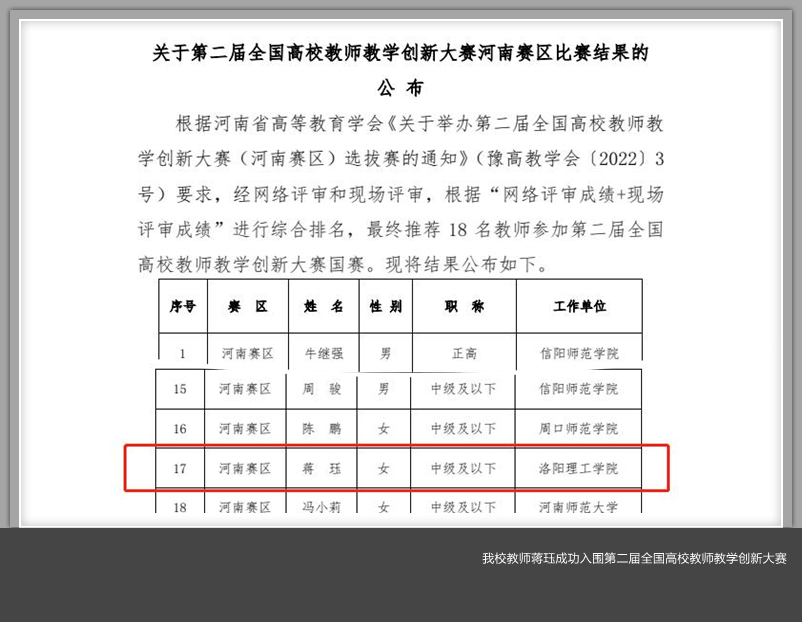 教师蒋珏成功入围,将代表河南省参加第二届全国高校教师教学创新大赛。