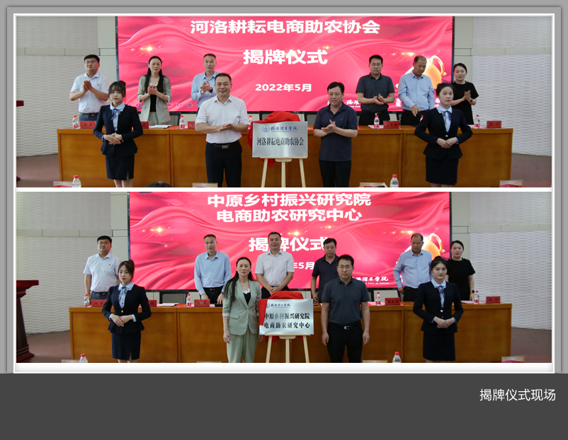 、洛阳源耕品牌运营管理有限公司负责人分别发言,介绍了本次大赛举办的初衷以及获得的成绩。获奖学生代表通过亲身经历发表了对比赛的感悟和感想。杨爱国和副校长马珺共同为“中原乡村振兴研究院电商助农研究中心”揭牌,杨红朝和校长张锐共同为“河洛耕耘电商助农协会”揭牌。