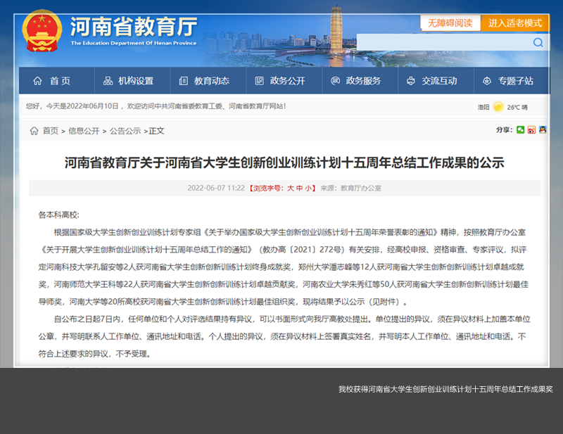 近日,河南省教育厅发布《河南省大学生创新创业训练计划十五周年总结工作成果的公示》,美高梅娱乐场