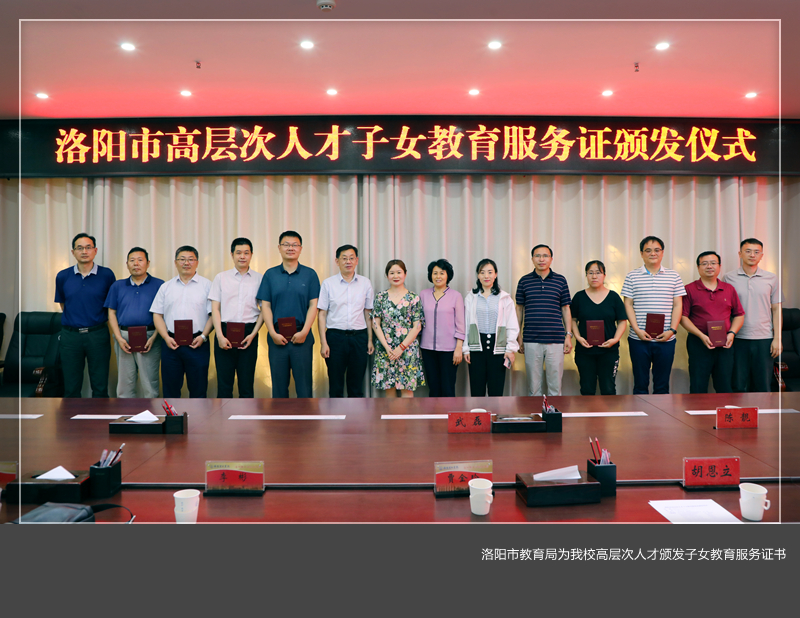 为获批“洛阳市高层次人才”称号的教师颁发子女教育服务证书。副校长胡恩立出席颁发仪式,党委组织部、人事处、校工会等部门负责人及获批“洛阳市高层次人才”的教师代表参加仪式。人事处负责人主持仪式。