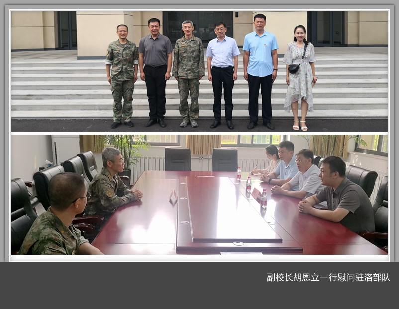 在中国人民解放军建军95周年来临之际,为进一步扎实做好“八一”期间拥军优属工作, 7月29日,副校长胡恩立带领武装部相关负责同志一行分赴洛阳市军分区、驻洛某部、洛龙区人武部等单位进行慰问走访,并同洛阳市军分区副司令员王更军等进行座谈。