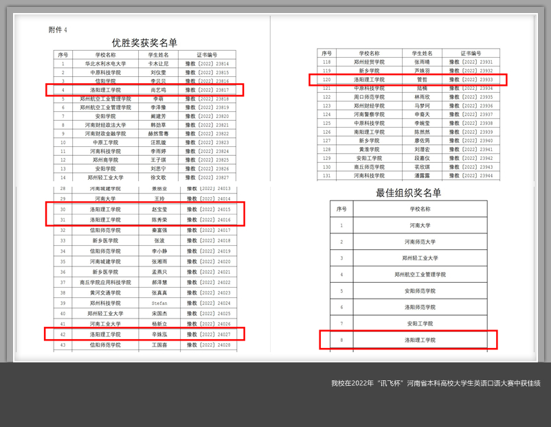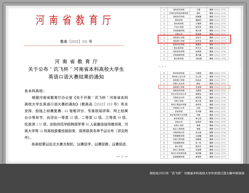 近日,河南省教育厅下发了《河南省教育厅关于公布“讯飞杯”河南省本科高校大学生英语口语大赛结果的通知》(教高〔2022〕231号)。经线上初赛复赛、AI智能评分、专家现场评审,网上结果公示等环节,最终美高梅娱乐场