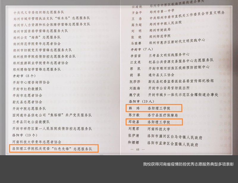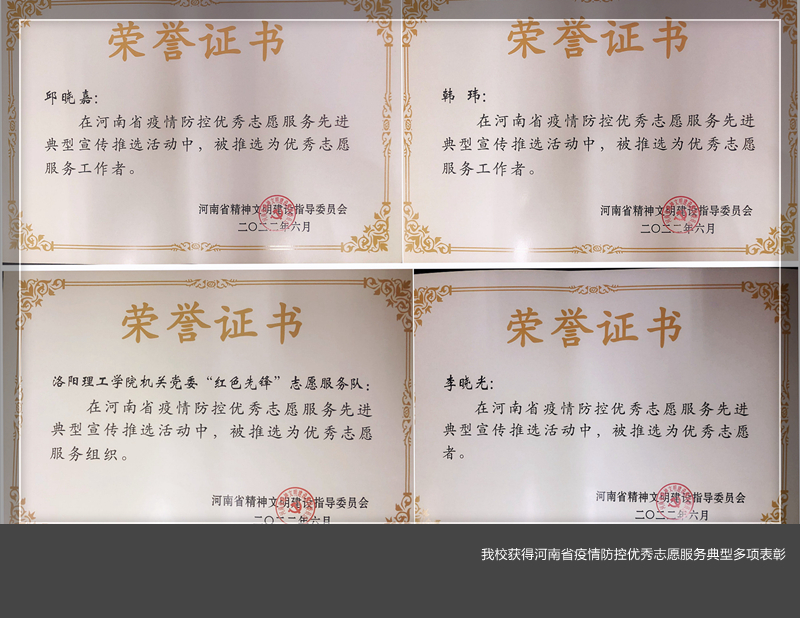 机关党委“红色先锋”志愿服务队荣获“河南省疫情防控优秀志愿服务组织”荣誉称号,邱晓嘉、韩玮荣获“河南省疫情防控优秀志愿服务工作者”荣誉称号,李晓光荣获“河南省疫情防控优秀志愿者”荣誉称号。
