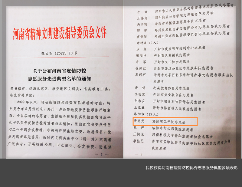 近日,省精神文明建设指导委员会下发《关于公布河南省疫情防控志愿服务先进典型名单的通知》(豫文明〔2022〕13号),对全省疫情防控优秀志愿者、优秀志愿服务组织、优秀志愿服务工作者等先进典型进行表彰。美高梅娱乐场
