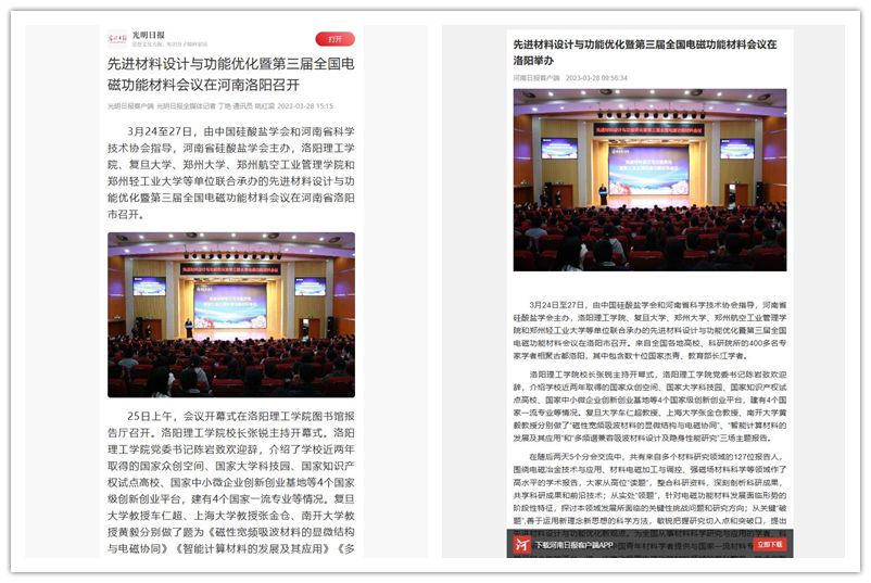 1.《光明日报》客户端 2023-03-28《先进材料设计与功能优化暨第三届全国电磁功能材料会议在河南洛阳召开》: