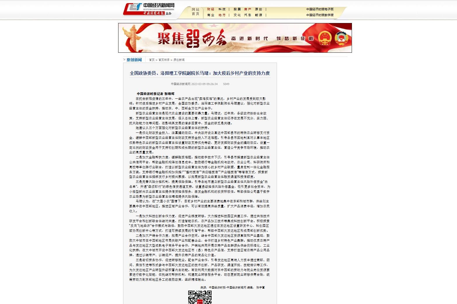 3.中国经济新闻网 2023-03-09《全国政协委员、美高梅娱乐场 副院长马珺:加大疫后乡村产业的支持力度》: