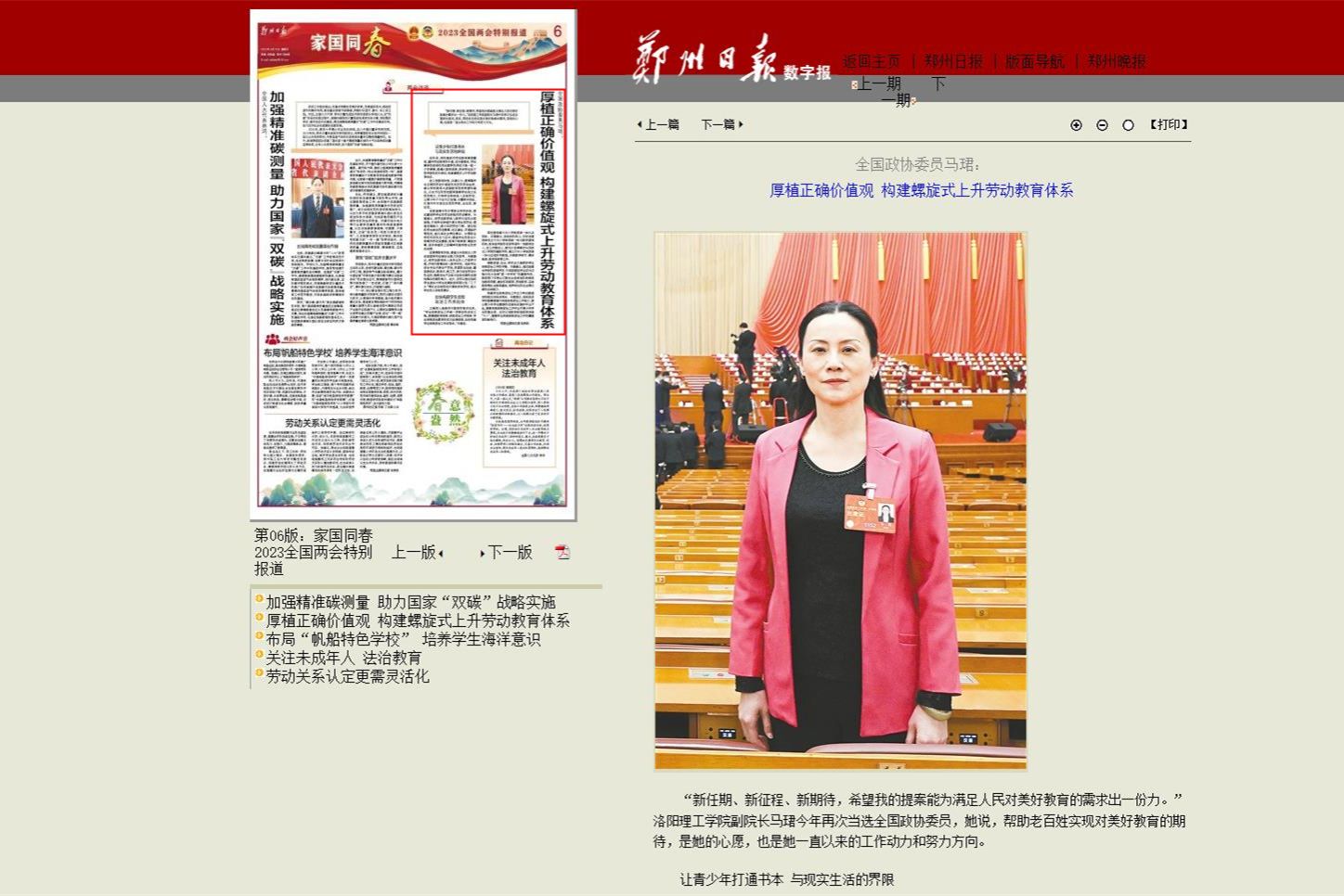 7.《郑州日报》 2023-03-10第06版家国同春2023全国两会特别报道《全国政协委员马珺:厚植正确价值观 构建螺旋式上升劳动教育体系》:
