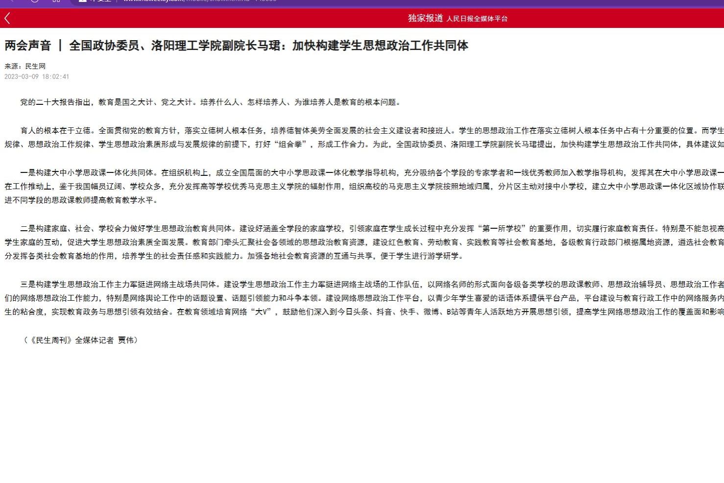 5.民生网 2023-03-09《两会声音 | 全国政协委员、美高梅娱乐场 副院长马珺:加快构建学生思想政治工作共同体》: