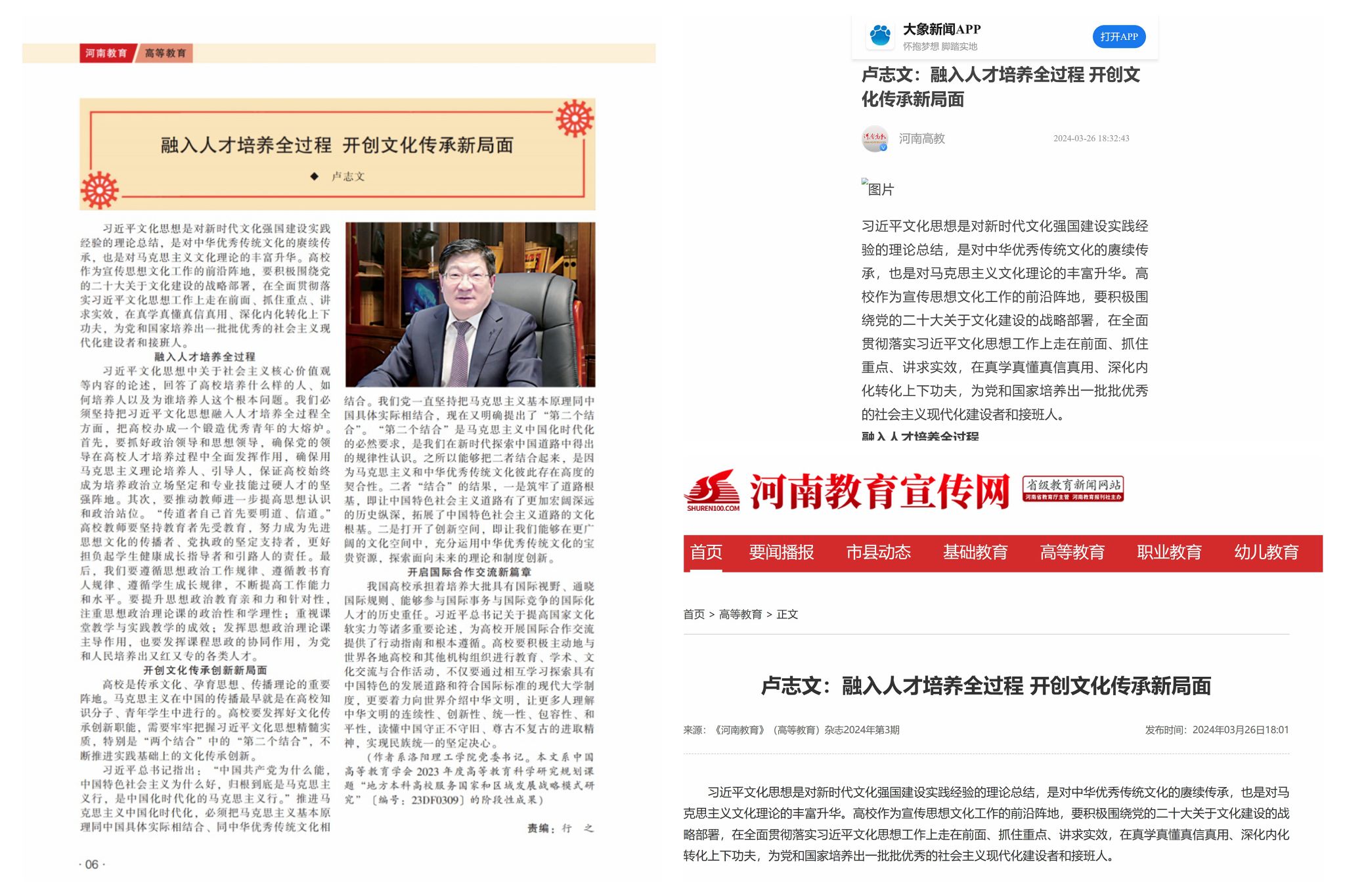 1、2024-03-26,《河南高教》官方微信公众号《卢志文:融入人才培养全过程 开创文化传承新局面》: