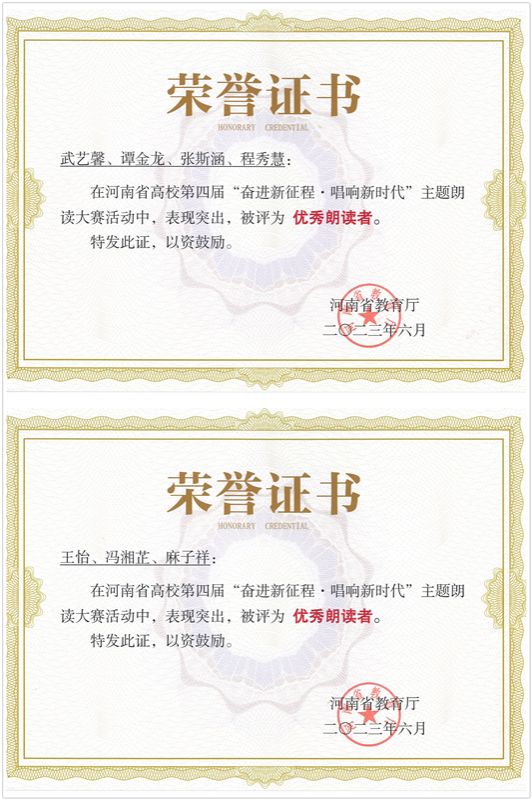 冯湘芷、武艺馨、谭金龙、张斯涵、程秀慧等7名学生被河南省教育厅评为河南省高校第四届主题朗读活动优秀朗读者。