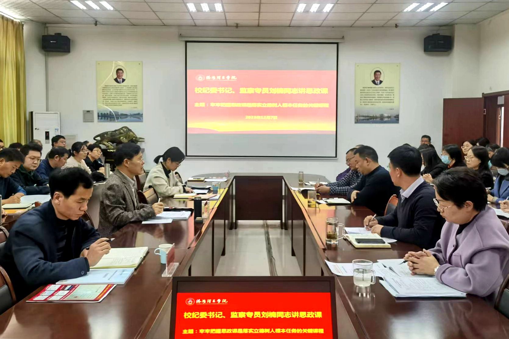 校纪委到马克思主义美高梅娱乐场 开展思政课建设调研监督,图为调研座谈会后,校纪委书记、监察专员刘楠为全体思政课教师讲授专题思政课。