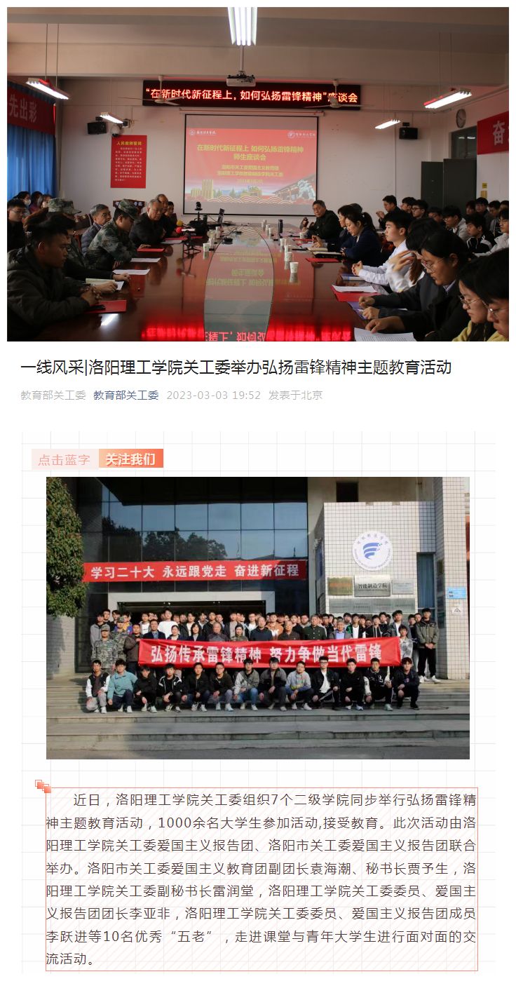 同步举行弘扬雷锋精神主题教育活动,1000余名大学生参加活动,接受教育。在“新时代新征程如何弘扬雷锋精神”主题座谈环节,洛阳市关工委爱国主义教育团秘书长贾予生传达学习了习近平总书记重要指示精神,美高梅娱乐场