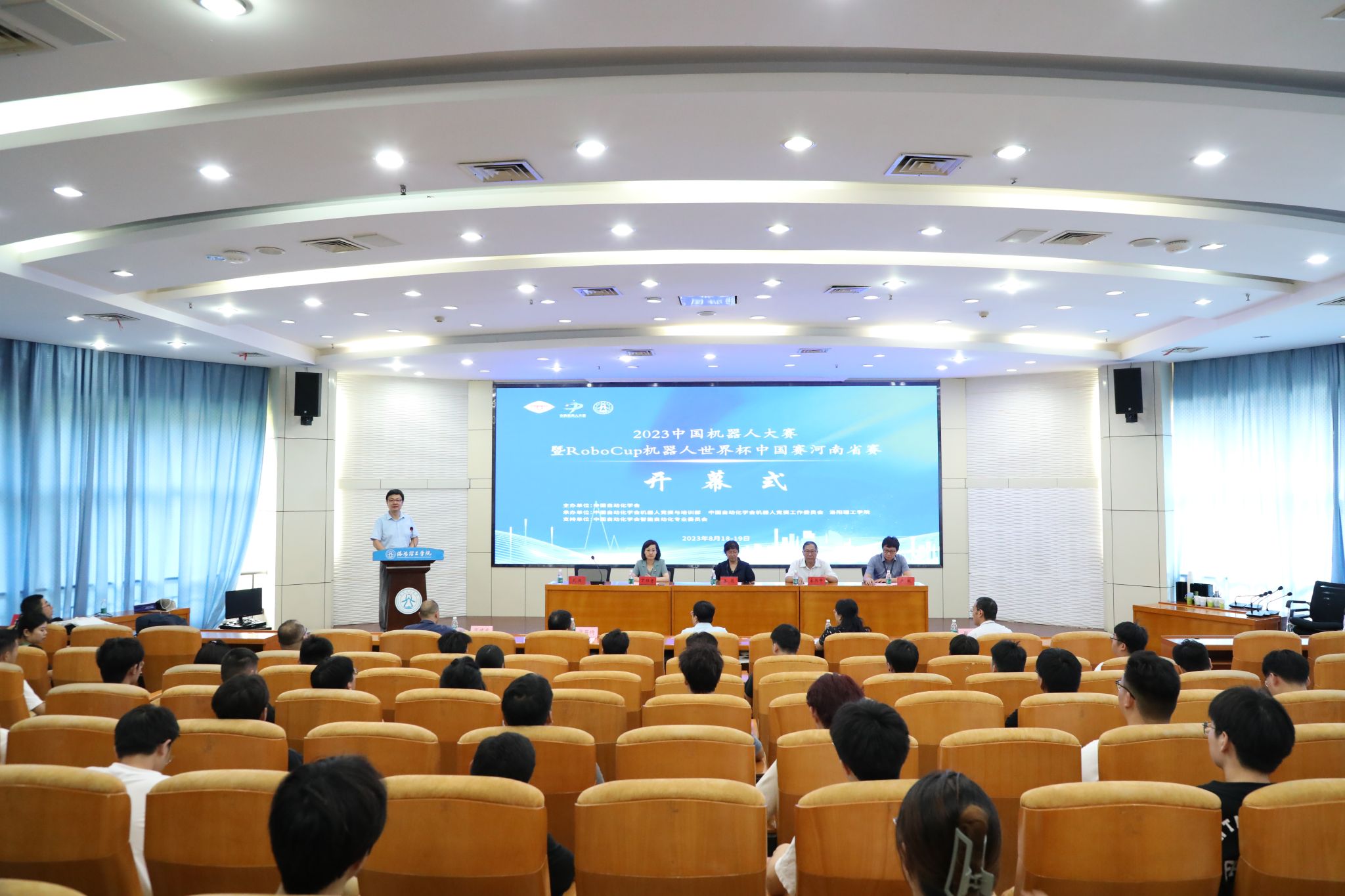 8月19日上午,2023中国机器人大赛暨RoboCup机器人世界杯中国赛河南省赛在美高梅娱乐场 王城校区办公楼二楼报告厅开幕。本次大赛由中国自动化学会主办,美高梅娱乐场 电气工程与自动化美高梅娱乐场 、工程训练中心承办。中国自动化学会机器人竞赛与培训部副主任姜萌、机器人竞赛工作委员会副主任卢欣,河南科技大学原副校长宋书中,美高梅娱乐场 副校长丁梧秀出席开幕式,承办方教师代表、参赛队员代表、志愿者代表参加了开幕式。开幕式由美高梅娱乐场 电气工程与自动化美高梅娱乐场 院长主持。