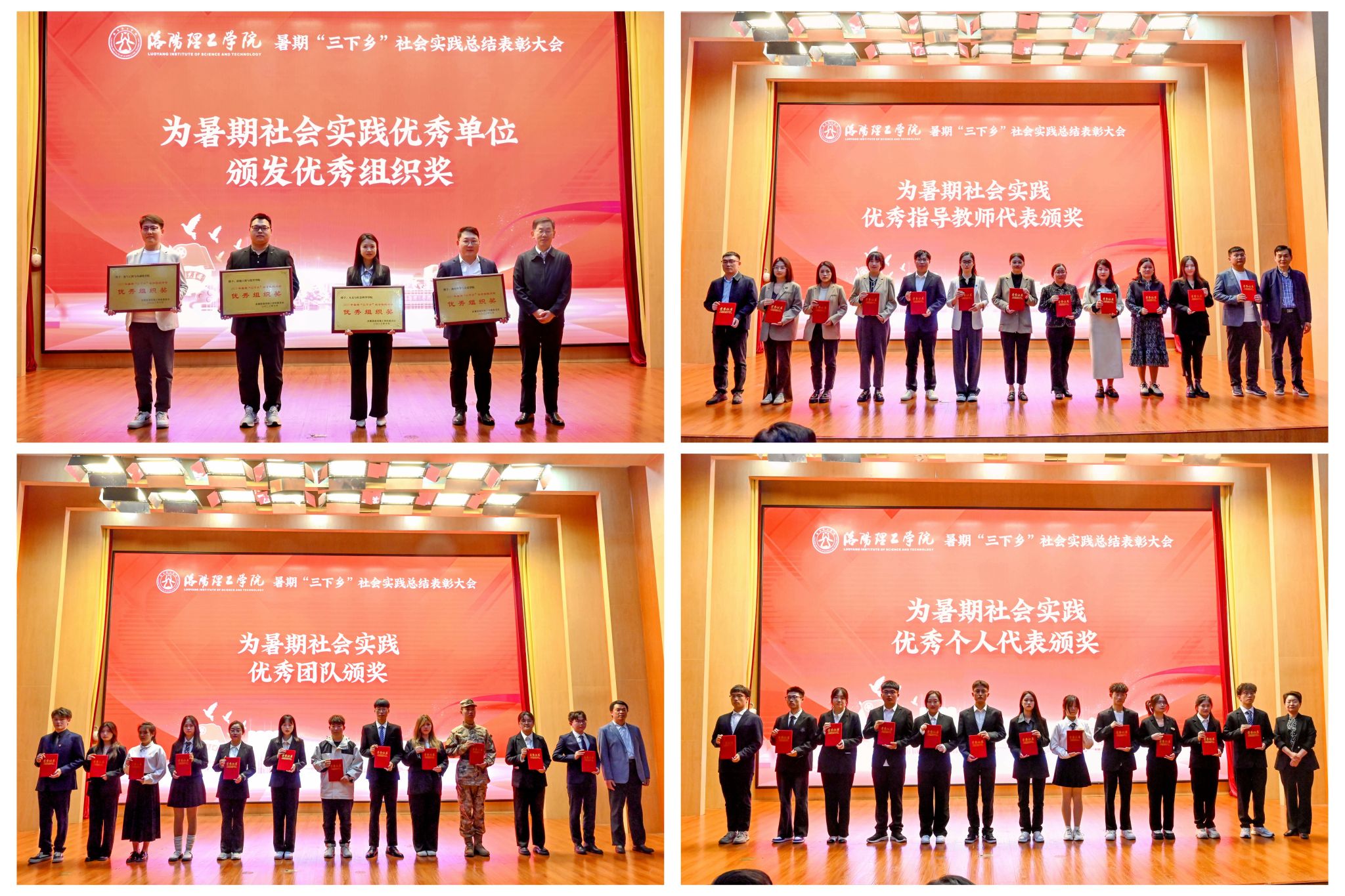 大会对本次暑期社会实践优秀个人代表、优秀服务团队、优秀指导教师代表、优秀组织奖进行表彰