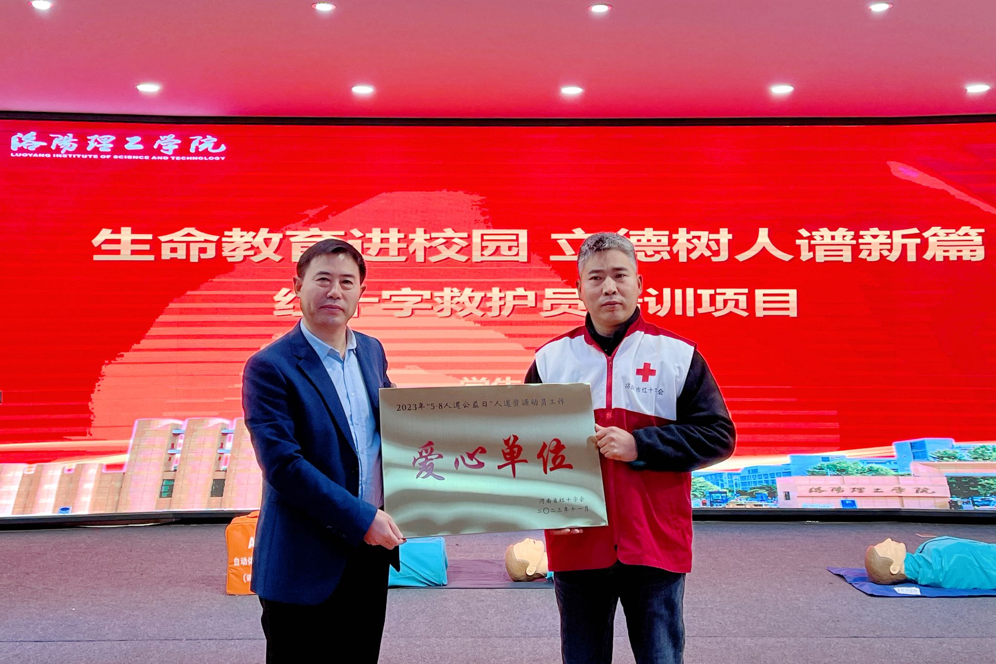 洛阳市红十字会红十字青少年事业发展中心主任赵海峡(右)代表河南省红十字会向美高梅娱乐场